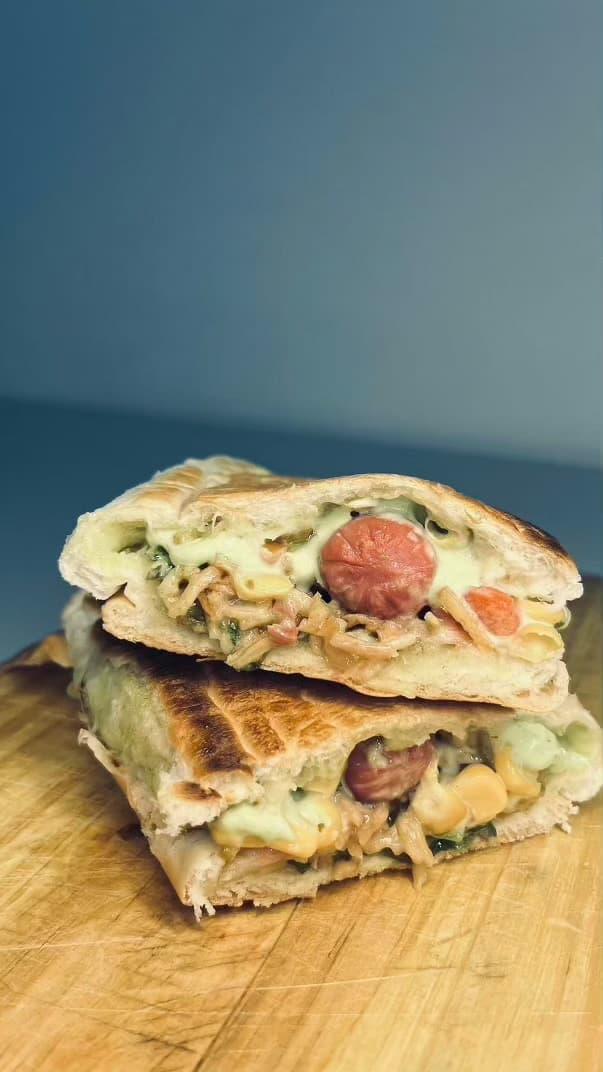 🧾 Ingredientes: Pão doce prensado, 2 salsichas, maionese da casa, ketchup, mostarda, milho, ervilha, alface, tomate e batata palha.