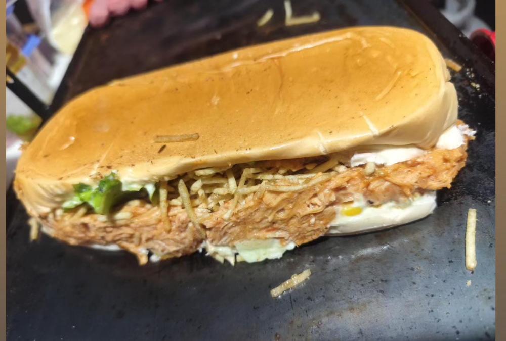🧾 Ingredientes: Pão doce prensado, frango desfiado, molho de tomate, creme de leite, maionese da casa, ketchup, mostarda, milho, ervilha, alface, tomate e batata palha.