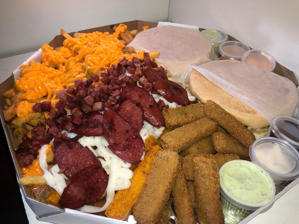2 Xis de Carne, Frango ou Calabresa (Bife de carne, queijo, ovo, maionese da casa, tomate, alface, milho, ervilha, ketchup e mostarda)+ Bata frita com cheddar e bacon+ Polenta frita com catupiry+ Calabresa + Nugguets + 2 potinhos de maionese da casa+ Molho rose, barbecue, chedder e catupiry+ 2 Sobremesas